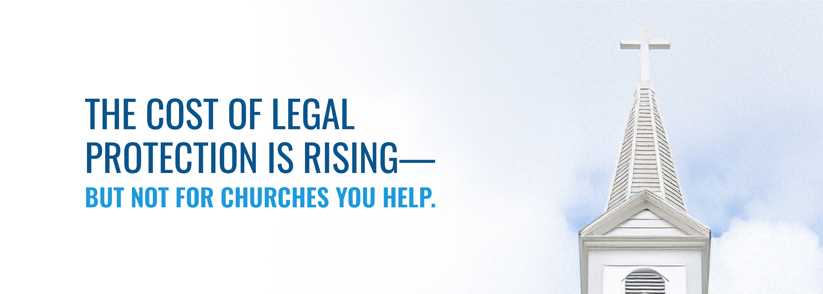 Lawsuits, government interference, and regulatory threats hit churches every week. Without help, legal defense could cost over $100,000.
